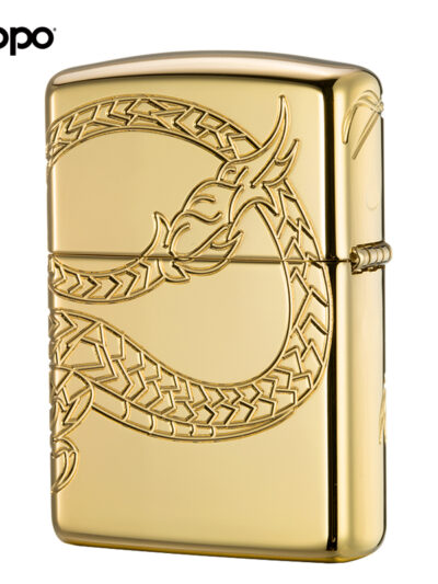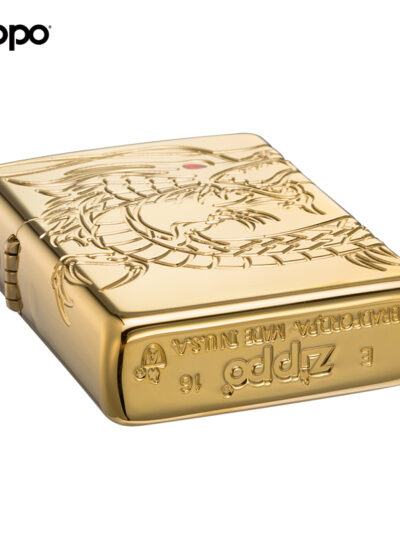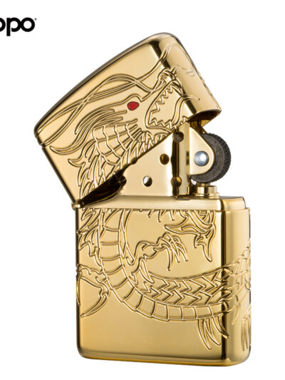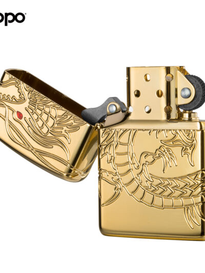 Chất liệu vỏ đồng thau ,nền mạ bằng vàng lớp ngoài. Họa tiết khắc sâu 360° hình rồng bay lượn quanh chiếc bật lửa, tạo điểm nhấn ở mắt gắn viên đá Epoxy đỏ.