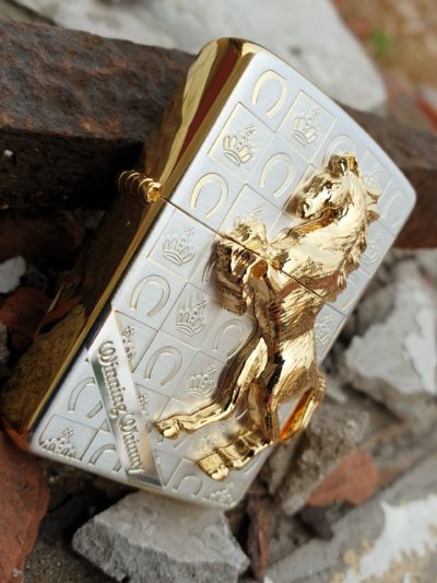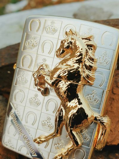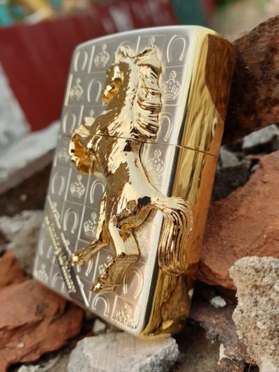 Bật lửa Zippo chính hãng ốp ngựa mạ vàng, nền trắng