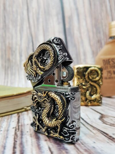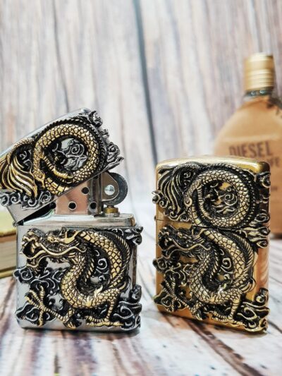 🐉 Mẫu Zippo mới nhất với hình tượng rồng vờn mây – rồng vàng cưỡi mây ốp nổi uốn quanh mặt trước và hông zippo.