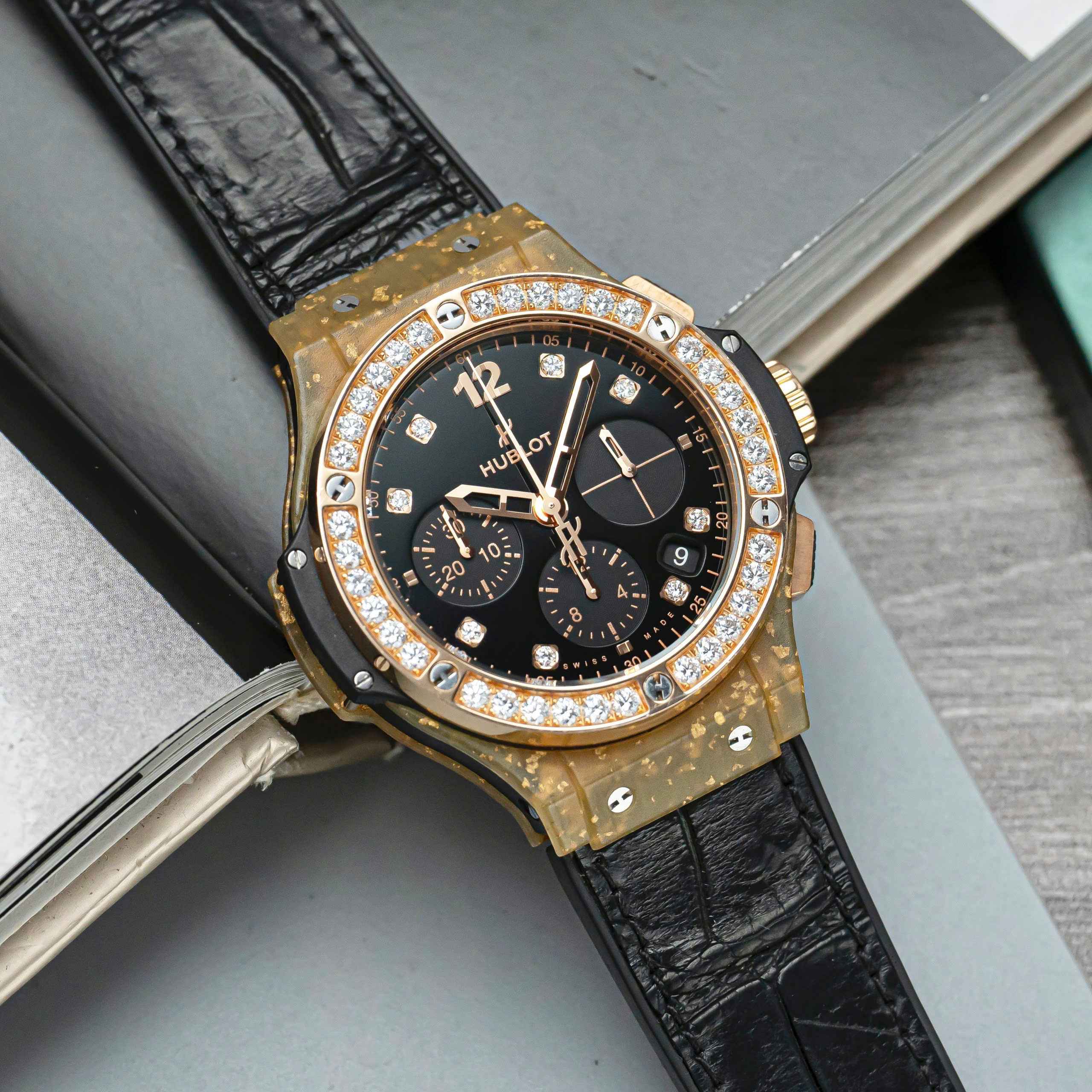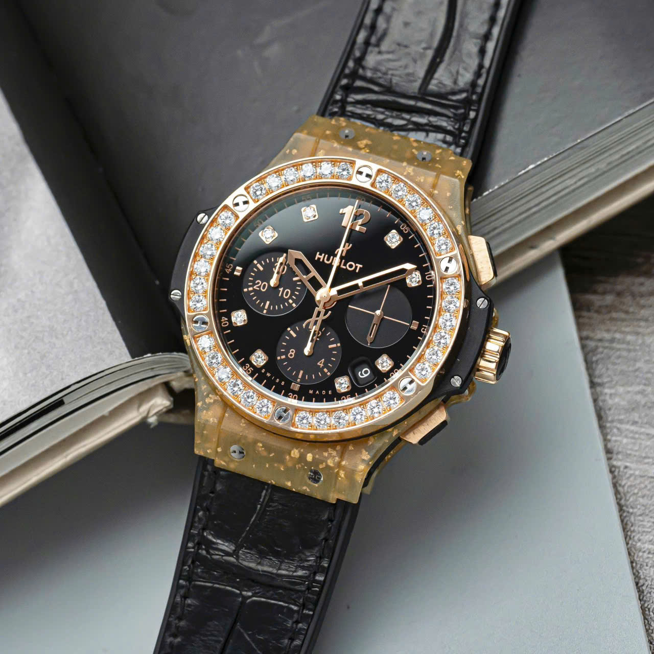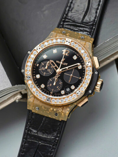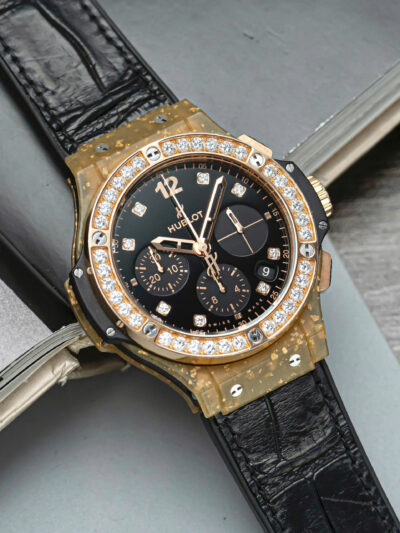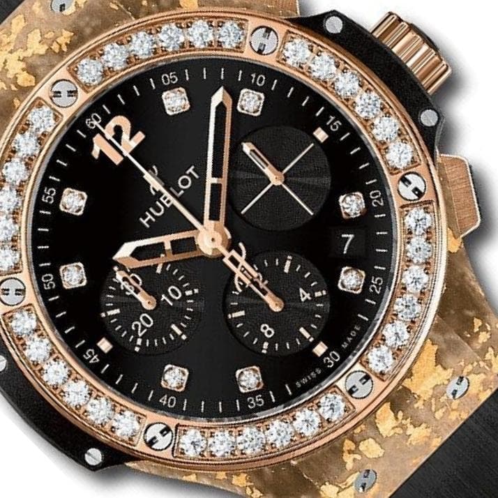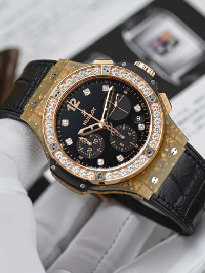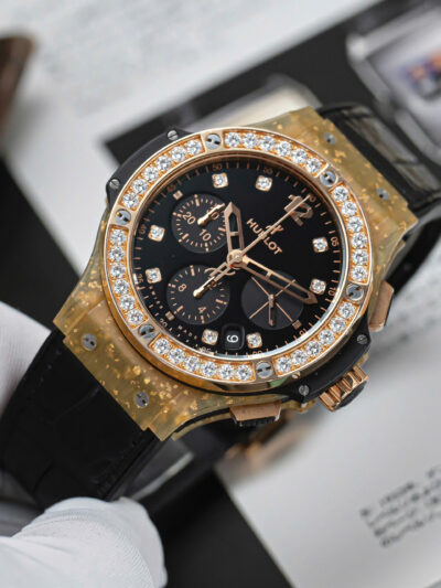Phần vành bezel được nạm 36 viên kim cương Brilliant Cut, xen lẫn giữa 6 chiếc ốc vít quen thuộc. Chất liệu này cũng được sử dụng trên mặt số, với 8 cọc số được đính kinh cương. Phần mặt số được hoàn thiện đen nhám khá dịu mắt, giúp những cọc số kim cương trở nên nổi bật hơn. Tất nhiên, Hublot cũng không quên tạo điểm nhấn trên bộ mặt của chiếc đồng hồ bằng 3 mặt số phụ được hoàn thiện chải tia khác biệt.