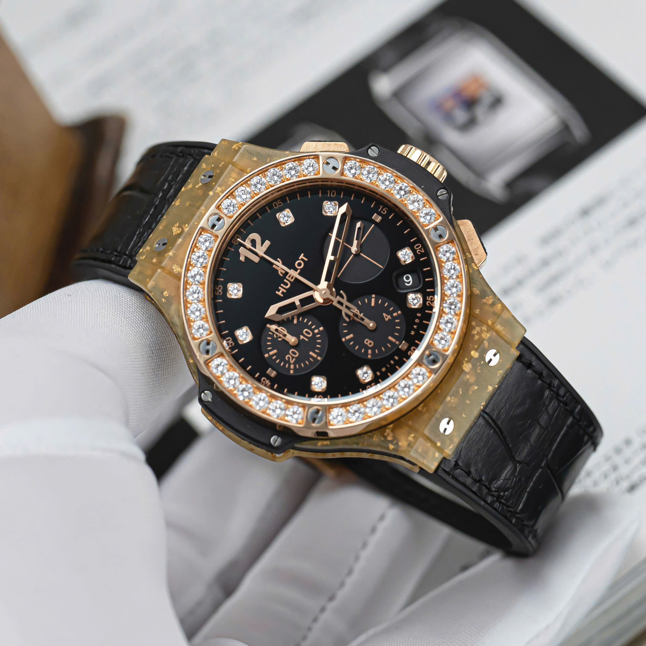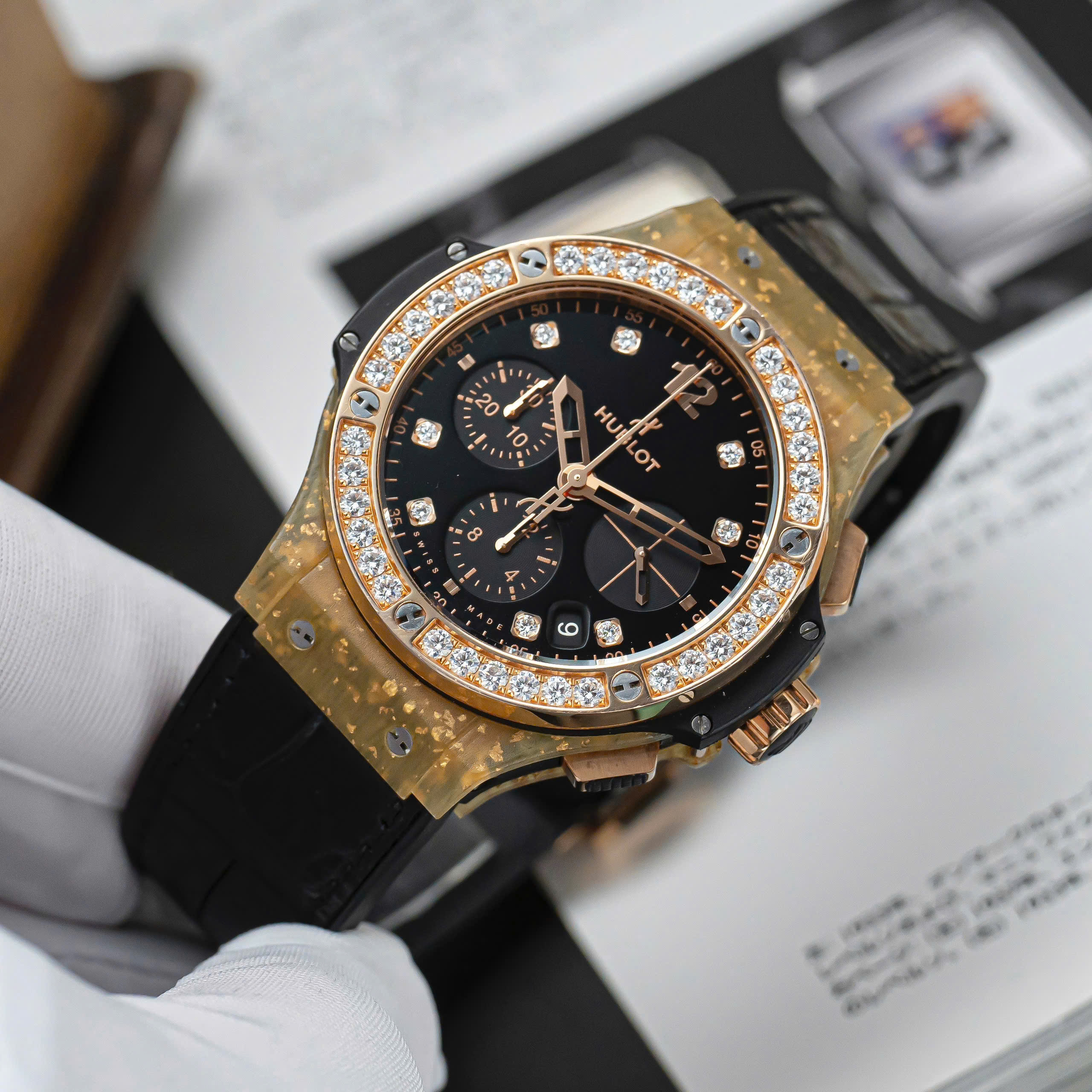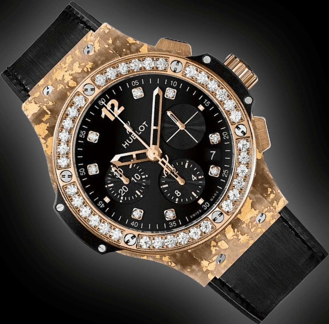 Phần vành bezel được nạm 36 viên kim cương Brilliant Cut, xen lẫn giữa 6 chiếc ốc vít quen thuộc. Chất liệu này cũng được sử dụng trên mặt số, với 8 cọc số được đính kinh cương. Phần mặt số được hoàn thiện đen nhám khá dịu mắt, giúp những cọc số kim cương trở nên nổi bật hơn. Tất nhiên, Hublot cũng không quên tạo điểm nhấn trên bộ mặt của chiếc đồng hồ bằng 3 mặt số phụ được hoàn thiện chải tia khác biệt.