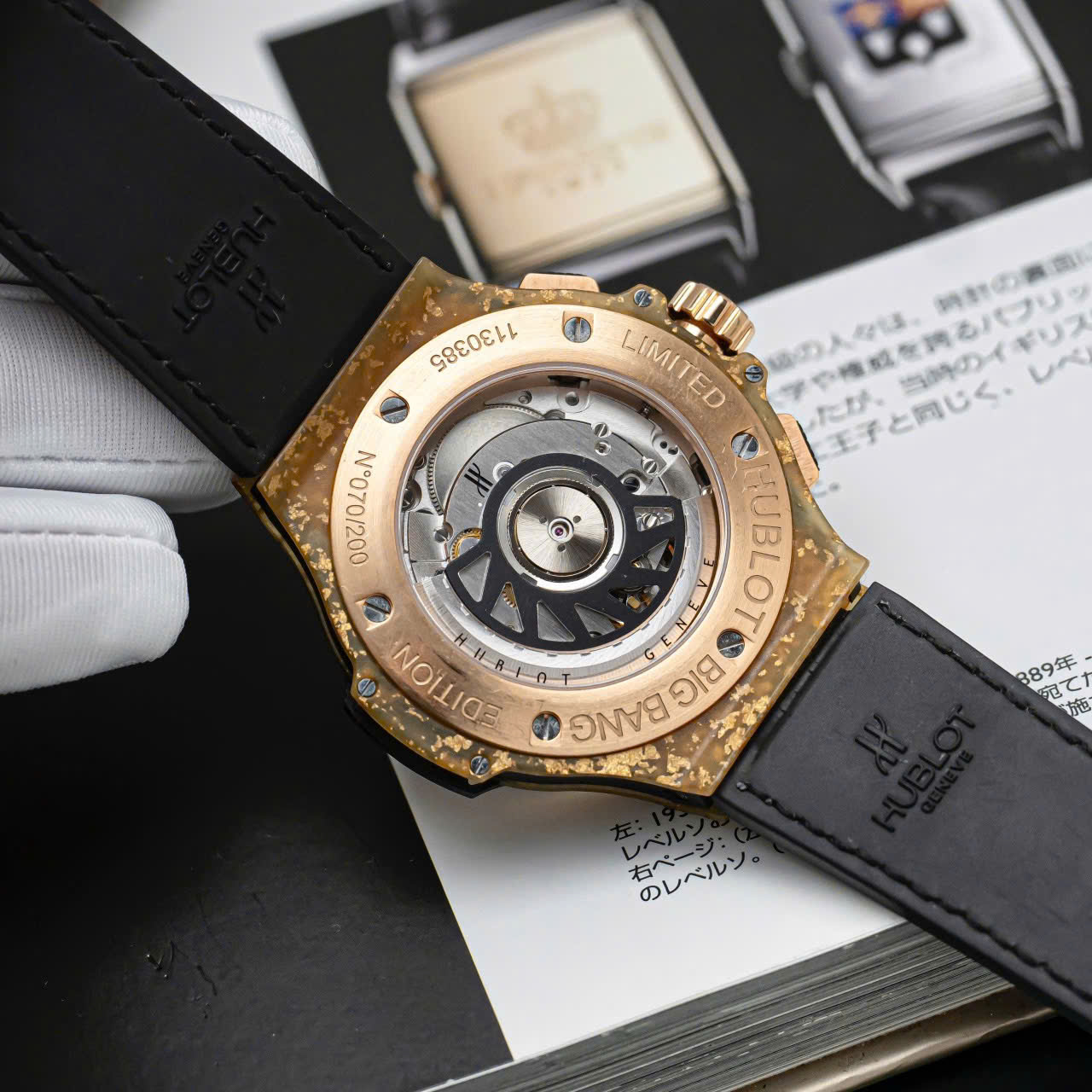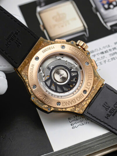 Đặc biệt hơn, với chiếc Big Bang Gold Linen 341.XN.1280.NR.1204, Hublot còn đẩy mạnh kỹ thuật sử dụng sợi lanh lên một tầm cao mới. Bên trong hỗn hợp sợi lanh, nhựa tổng hợp đó còn được điểm xuyết thêm những tấm vàng nguyên chất, tạo nên một thiết kế cực kỳ đặc biệt mà chỉ Hublot có thể tạo ra.