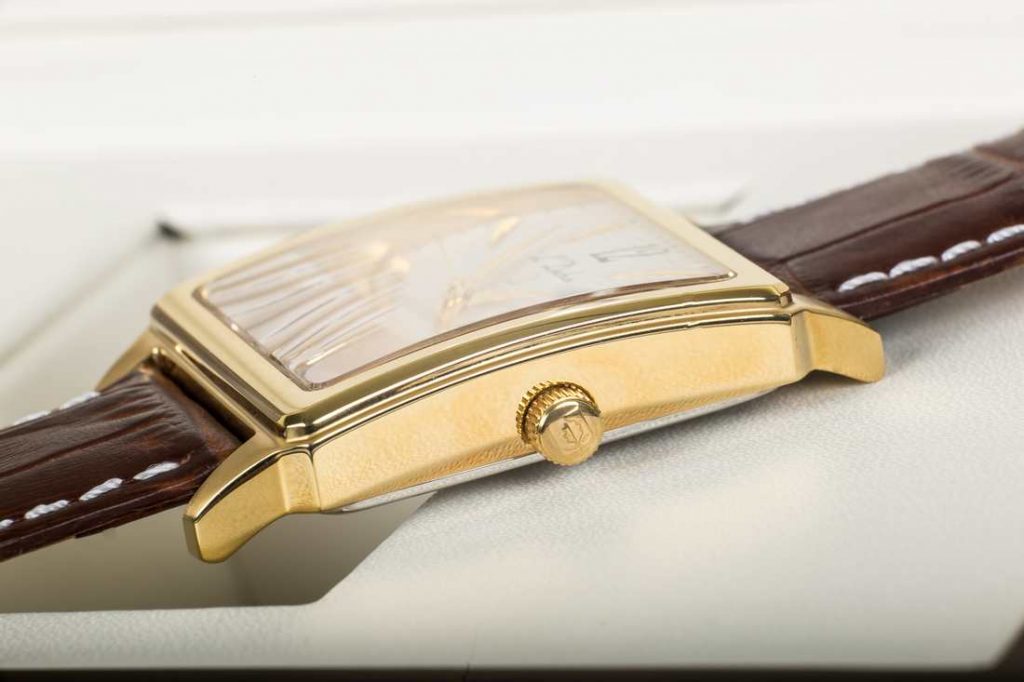 Mẫu đồng hồ này sở khuôn mặt hình vuông phảng phất yếu tố cổ điển, size mặt 33x35mm với viền ngoài làm từ thép không gỉ mạ vàng công nghệ PVD cao cấp, khiến mặt đồng hồ trở nên sáng bóng. Như vậy, những yếu tố sáng tạo về mặt thiết kế cũng như chọn lựa nguyên liệu chế tác khắt khe đã giúp diện mạo bên ngoài đồng hồ thêm sang trọng, là điểm nhấn cho bộ mặt to, khá nổi bật của sản phẩm. Nói thêm về chất liệu, mặt kính đồng hồ chế tác từ chất liệu kính sapphire nguyên khối, với chất liệu kính này thì độ chống va đạp, chống xước và chống lóa rất tốt.