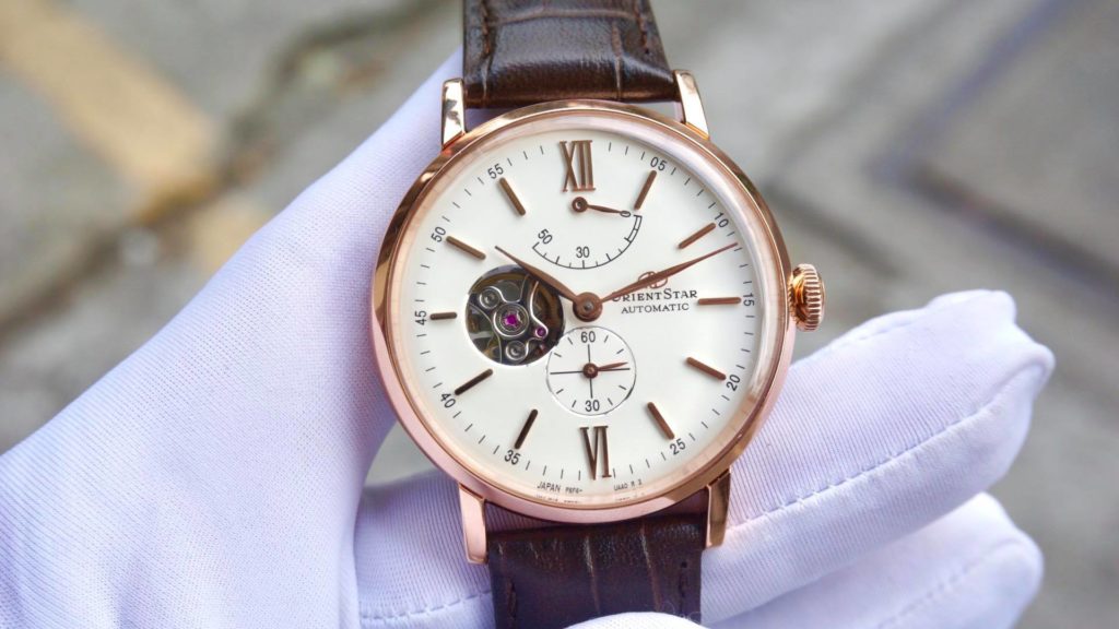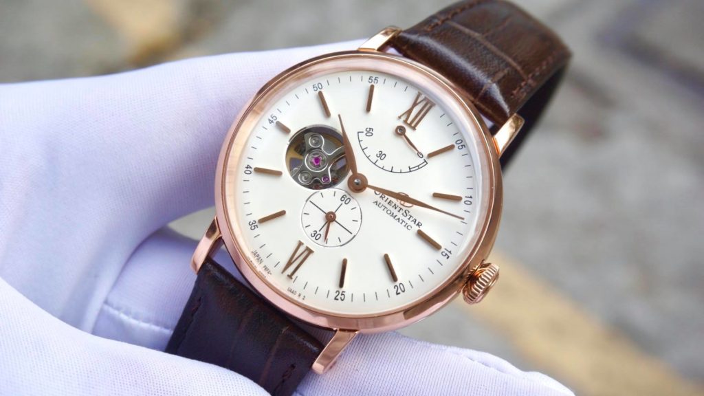 Mẫu Orient RE-AV0001S00B phiên bản Skeketon nổi bật với ô chân kính lộ tim phô diễn ra 1 phần hoạt động bộ máy cơ bên trong tạo nên vẻ độc đáo sang trọng với phần vỏ máy kim loại mạ vàng hồng.