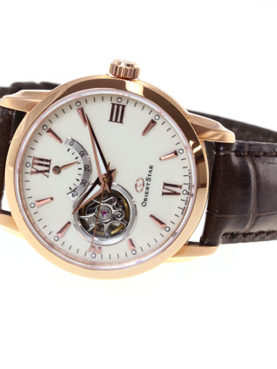 Đồng hồ Orient WZ0211DA Open Heart Power Reserve với mặt sô màu trắng và các cạc số được mà vàng óng cùng màu với phần vỏ bên ngoài. Vỏ máy bằng thép không gỉ mạ vàng công nghệ PVD cao cấp, kết hợp cùng dây đeo da màu nâu tạo nên phong cách lịch lãm, sang trọng cho phái mạnh.