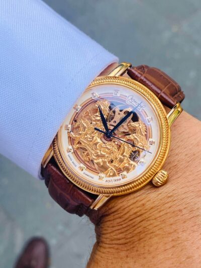 Diện mạo bảnh bao, chế tác cầu kì luôn là những gì người tiêu dùng nhận xét về chiếc đồng hồ Ogival nam OG358.88AGR-GL. Được thiết kế với họa tiết là bầy ngựa gồm 8 chú ngựa oai phong lẫm liệt với những chi tiết tỉ mỉ và sáng tạo, chúng biểu tượng cho sự thăng tiến, gia tăng tiền tài và sự may mắn cho người sở hữu.