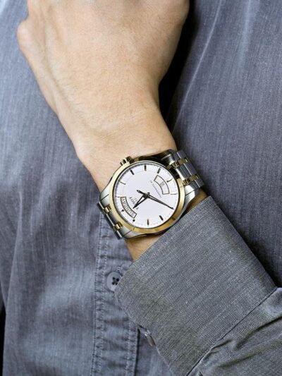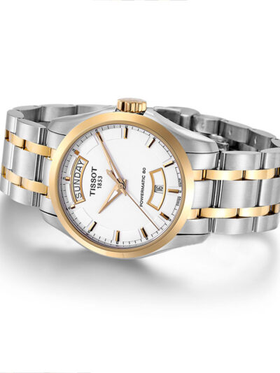 Màu sắc chủ đạo của chiếc Tissot này là trắng bạc và vàng demi, được thiết kế đan xen nhau. Ở dây đồng hồ màu trắng bạc có 2 đường vàng demi là điểm nhấn.