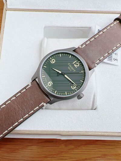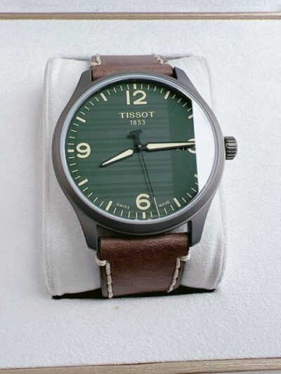 - – TISSOT T116.410.36.097.00 Thiết kế đơn giản năng động, dây da nâu kết hợp mặt xanh lá rất Tây. Cọc số hiện đại kết hợp ô lịch ngày góc 3h rất tiện lợi. Dây da sang trọng cho phép chủ nhân tha hồ diện đồ công sở.