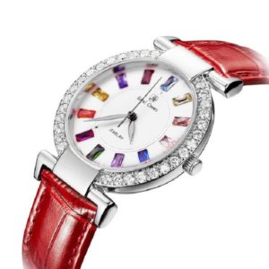 1. Đá đính trên vỏ và dây đồng hồ là đá CZ- Zirconia với độ cứng từ 8- 8,5 (Chất lượng rất tốt nếu so với Ruby: 9 và Kim cương: 10).