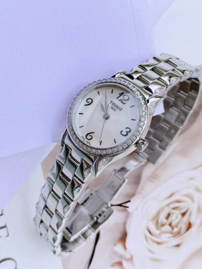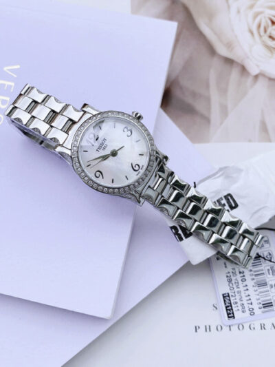 - TISSOT T028.210.11.117.00 viền mặt đính kim, vành dây 3 mắt 2 bên cũng được đính kim cương đẹp mắt. Mặt khảm trai, cọc số học trò và vạch xen kẽ, với chức năng giờ/phút/dây