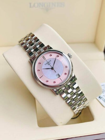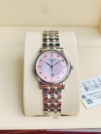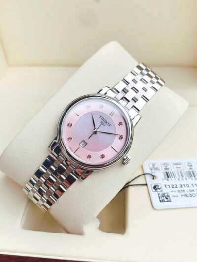 - – TISSOT T122.210.11.159.00 Một mẫu đồng hồ mới trong BST Carson dành cho các chị em với thiết kế đơn giản nhưng vẫn rất sang trọng,quý phái. Điểm nổi bật của mẫu đồng hồ này chính là 8 cọc số được đính đá Topaz hồng rất bắt mắt.Dial khảm trai phấn hồng độc đáo. Dây kim loại cực sang cho phép chủ nhân tha hồ diện đồ công sở.