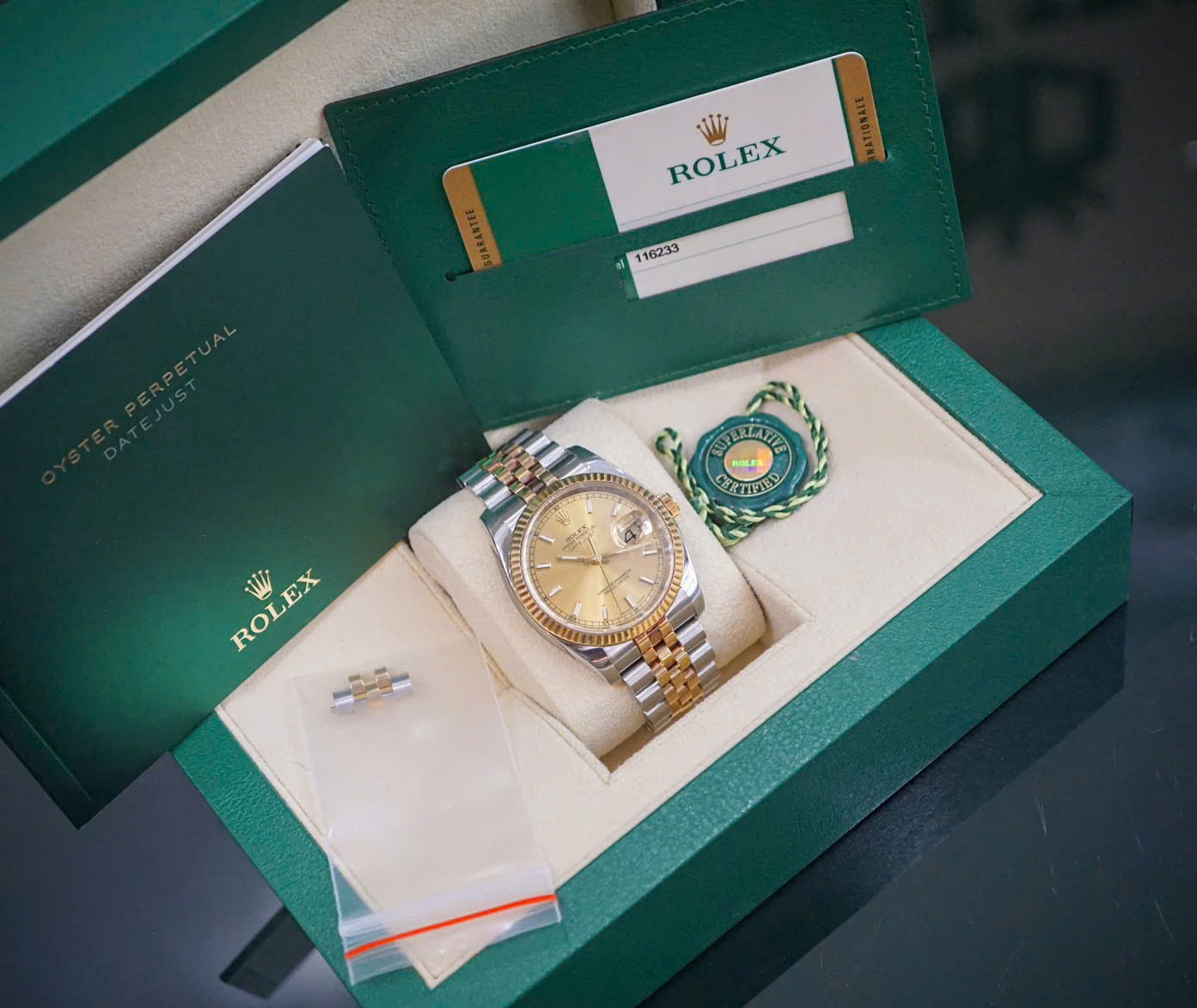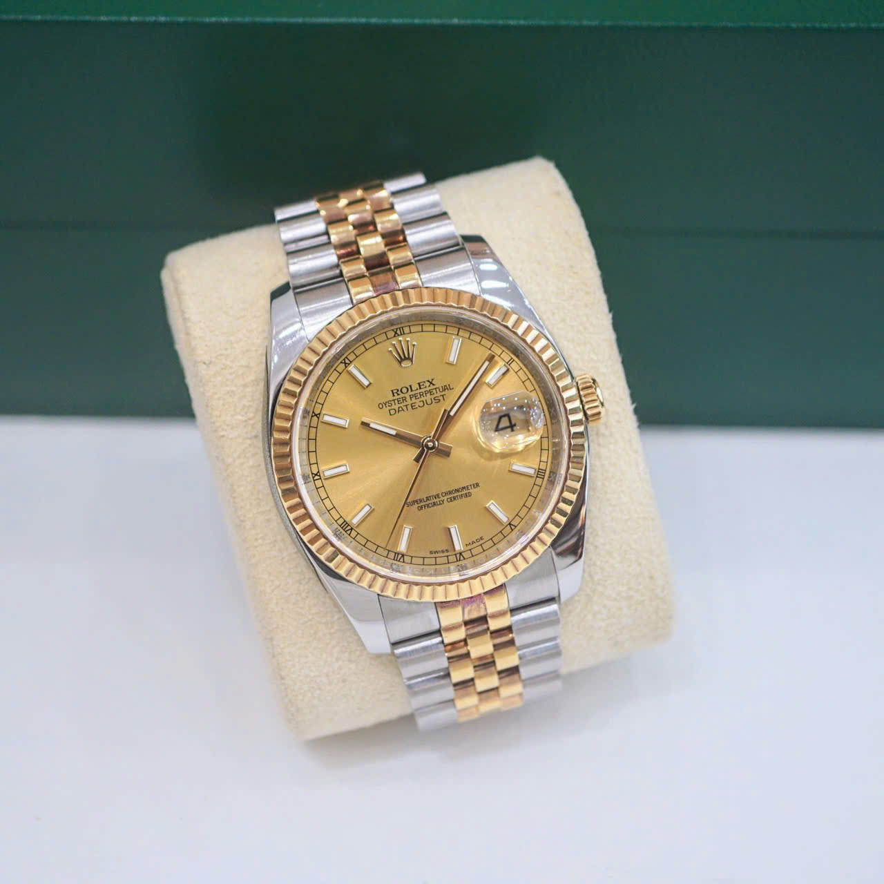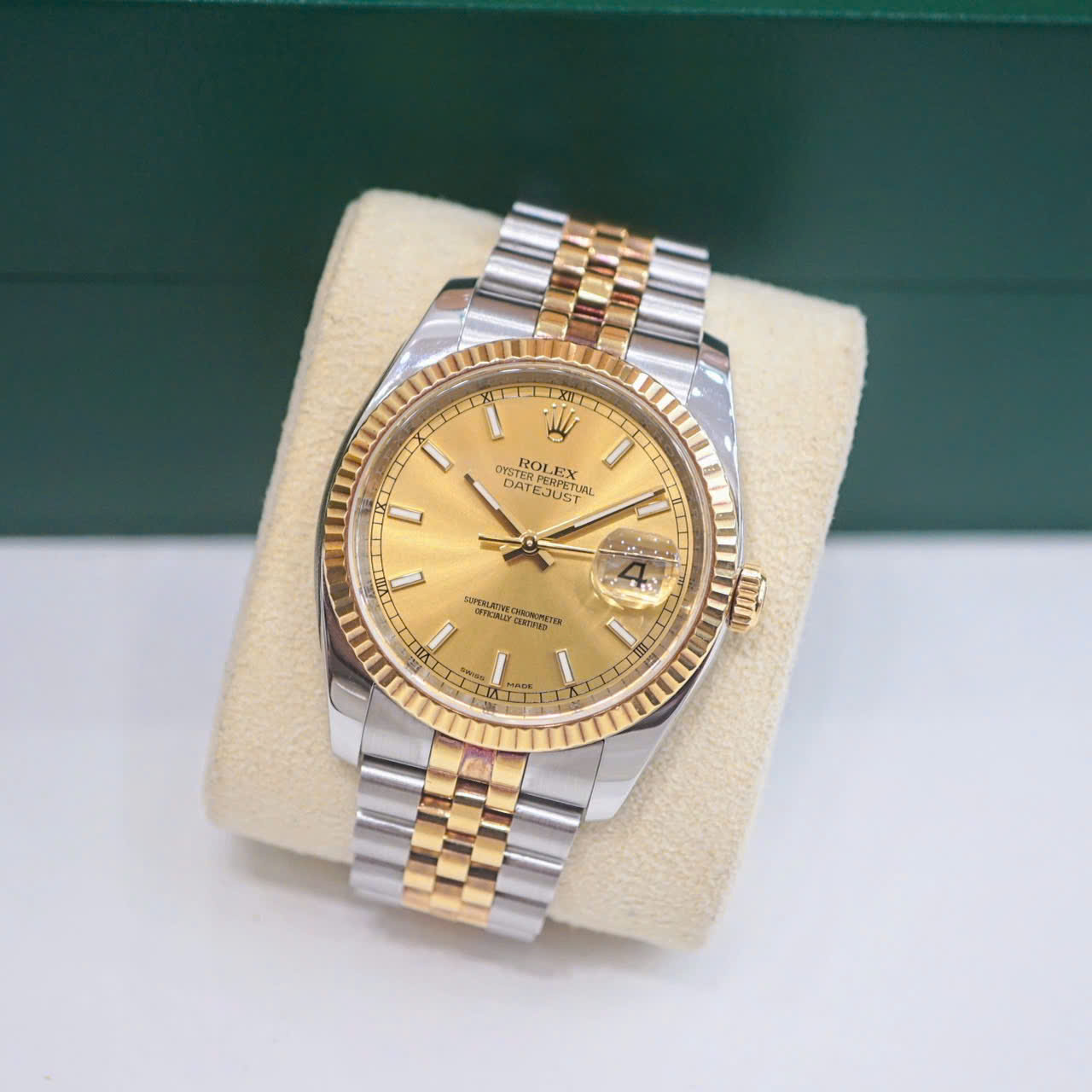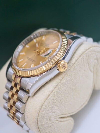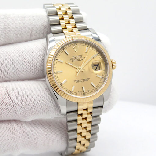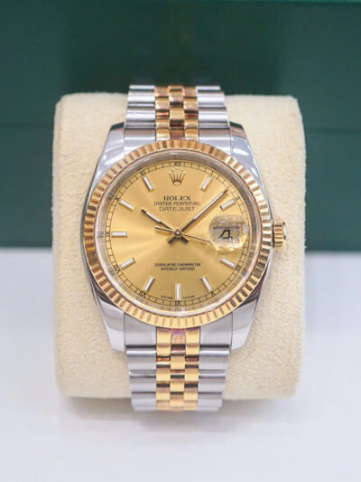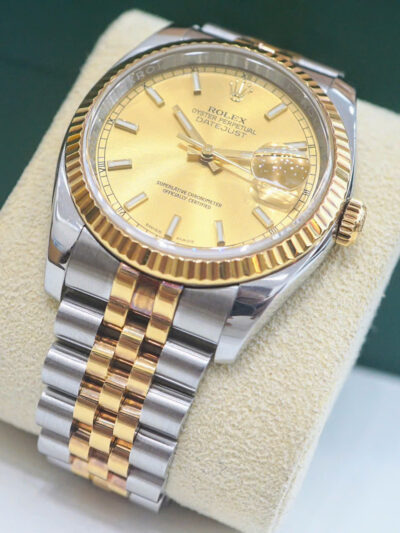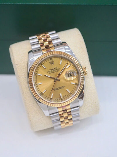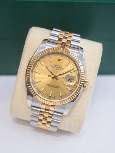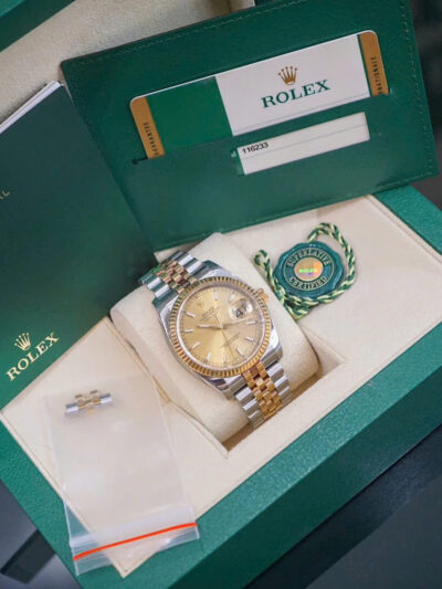 Rolex Datejust 36 Champagne 116233 là hiện thân hoàn hảo của sự kết hợp giữa kỹ thuật chế tác đỉnh cao và thiết kế thanh lịch vượt thời gian. Với mặt số champagne đính kim cương và cấu trúc demi vàng 18k – thép Oyster Steel, mẫu đồng hồ Rolex này không chỉ là một phụ kiện thời trang mà còn là biểu tượng của đẳng cấp và sự thành đạt.