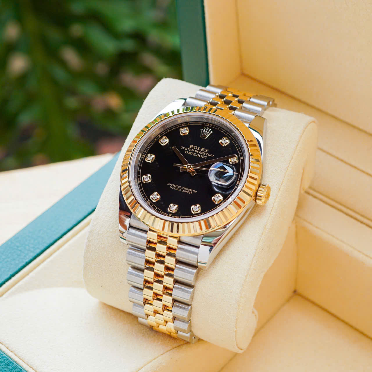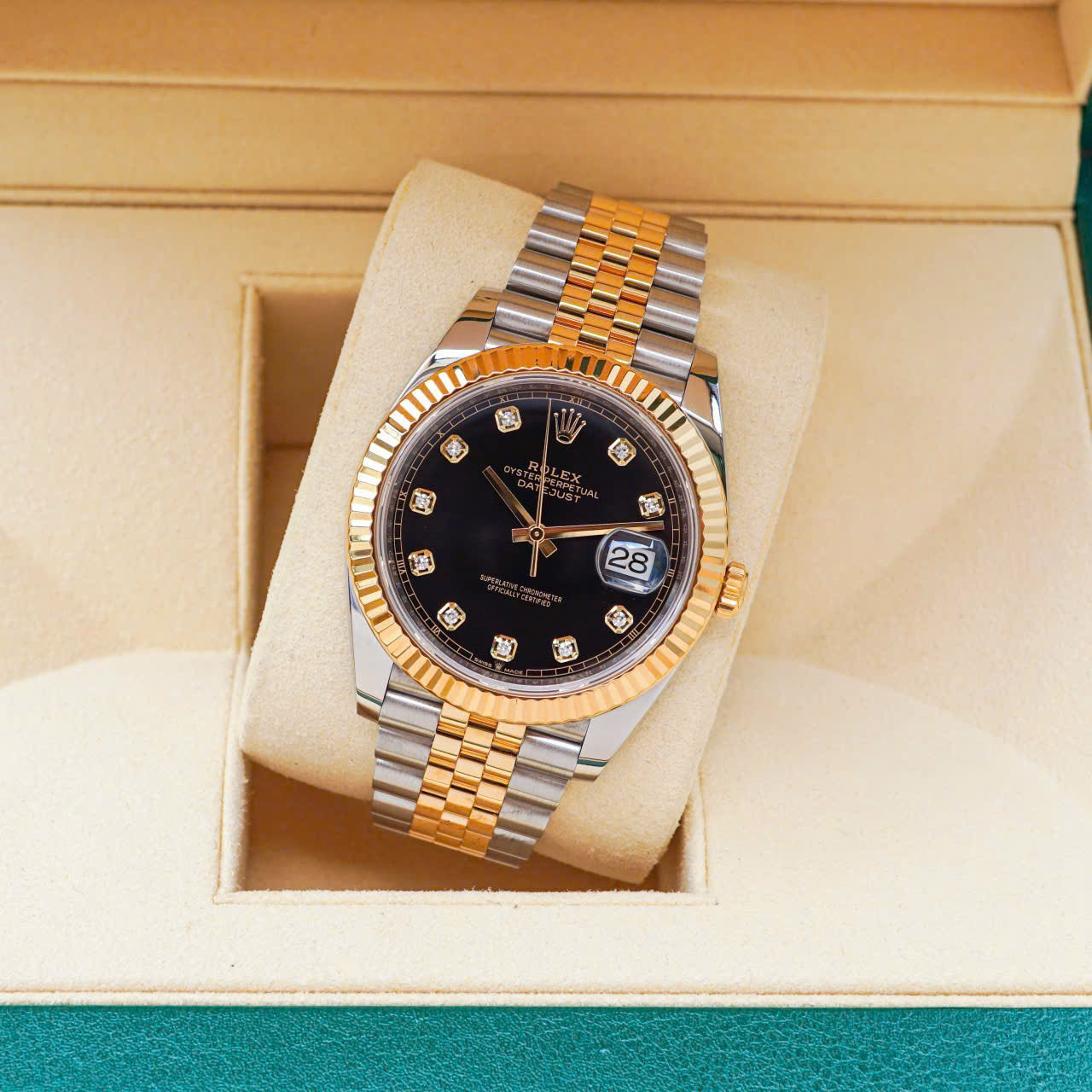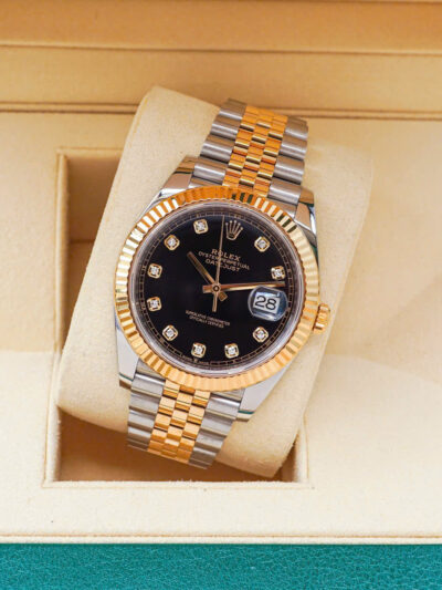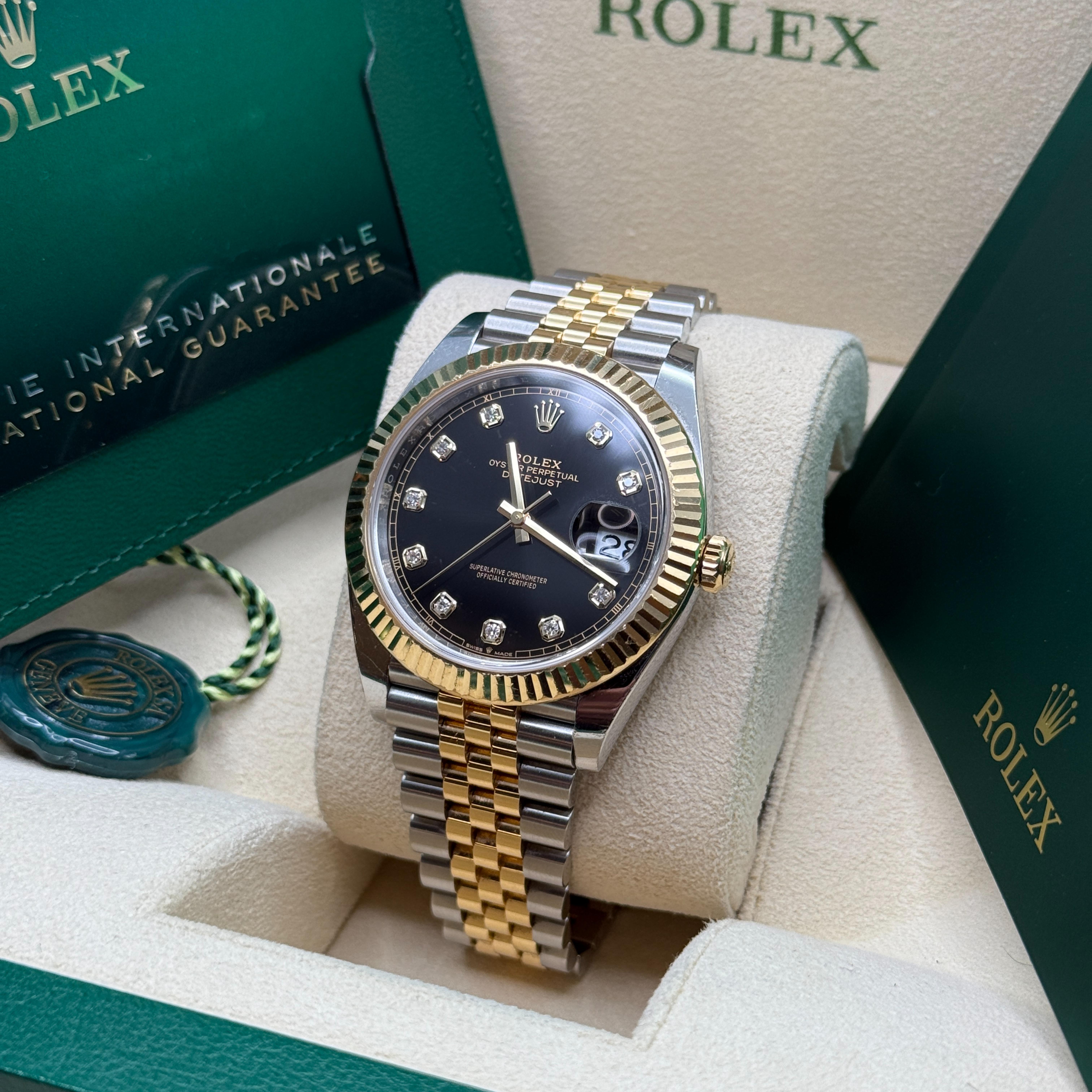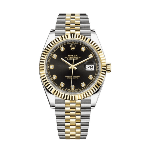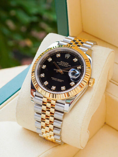 Đồng hồ Rolex Datejust 126333-0006 bằng thép Oystersteel và vàng kim đi kèm mặt số màu đen sáng, nạm kim cương và dây đeo Jubilee.
