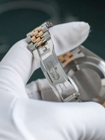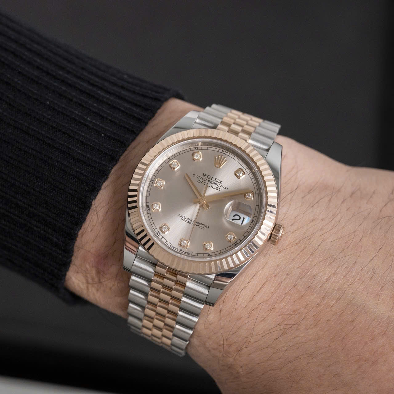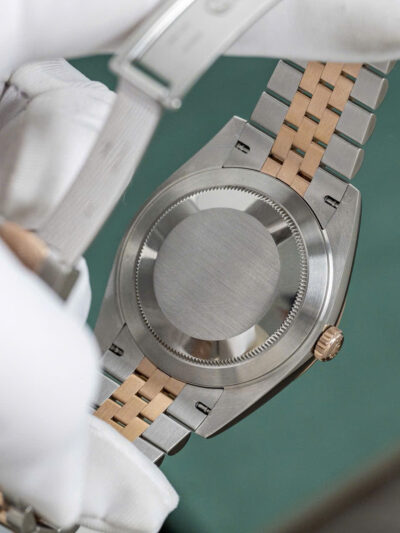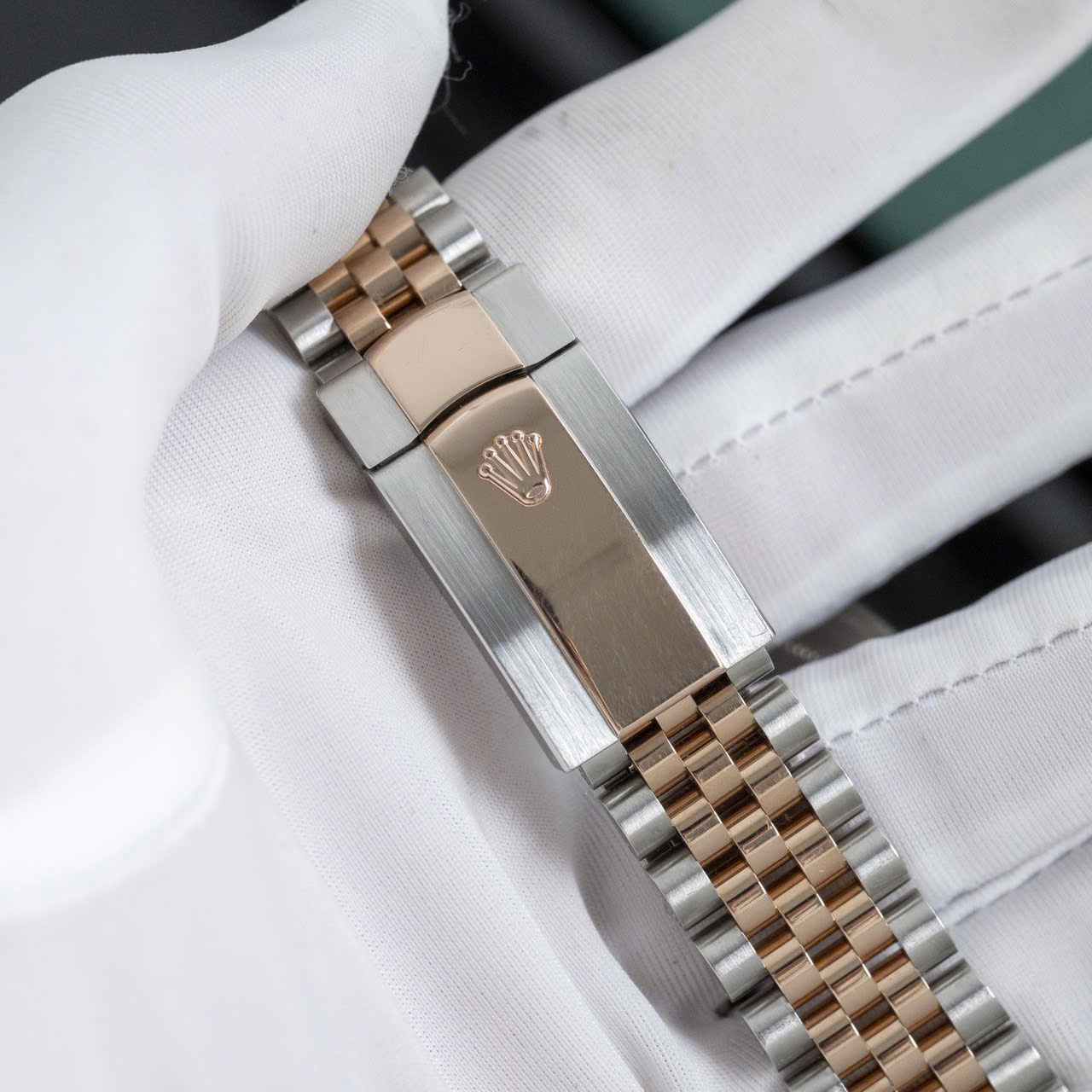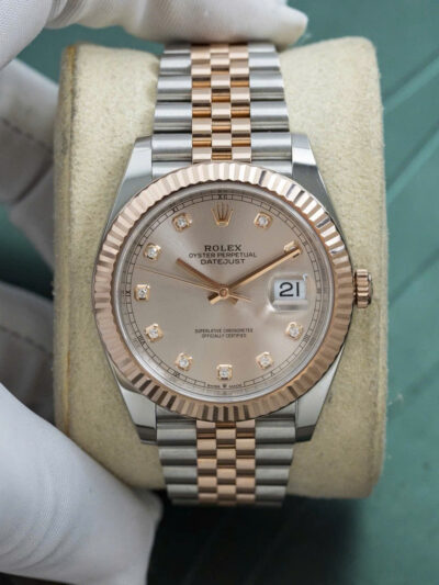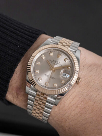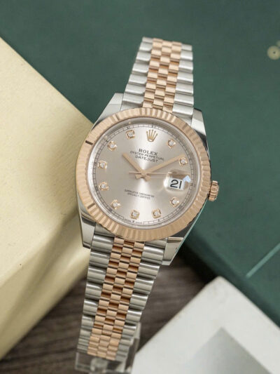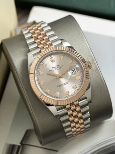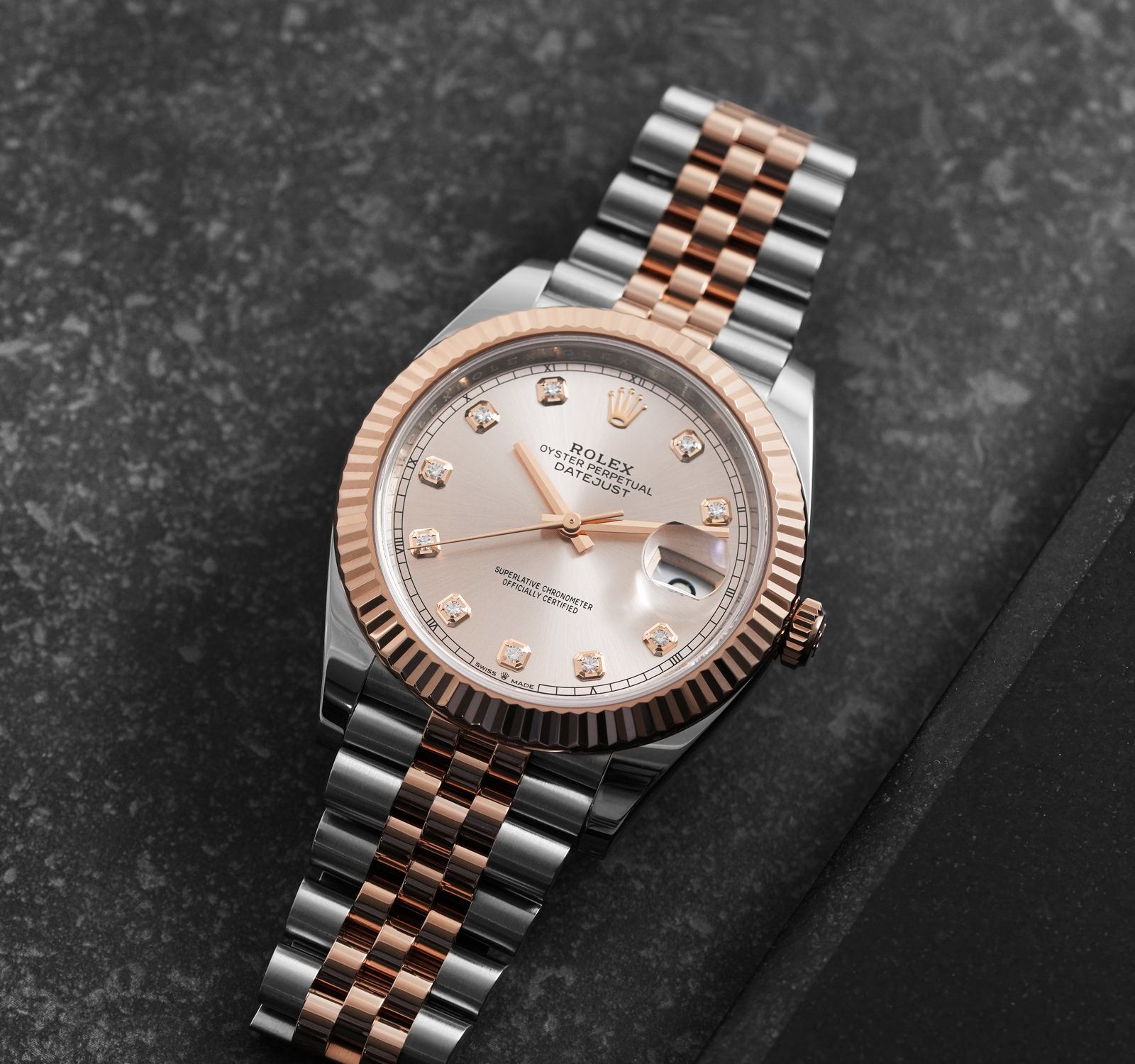 Mặt đồng hồ đi kèm khung vàng 18 ct nạm kim cương. Hiệu ứng tia mặt trời tạo ra sự phản chiếu ánh sáng tinh tế trên nhiều mẫu mặt đồng hồ của bộ sưu tập Oyster Perpetual. Phương pháp sử dụng các kỹ thuật chải thành thạo tạo ra các rãnh hướng từ trung tâm của mặt đồng hồ ra ngoài.