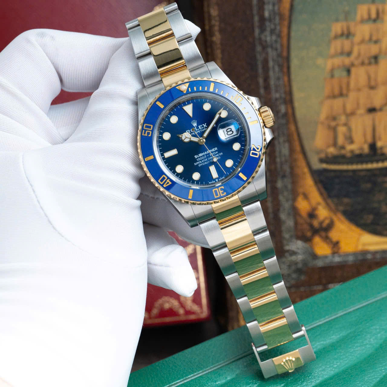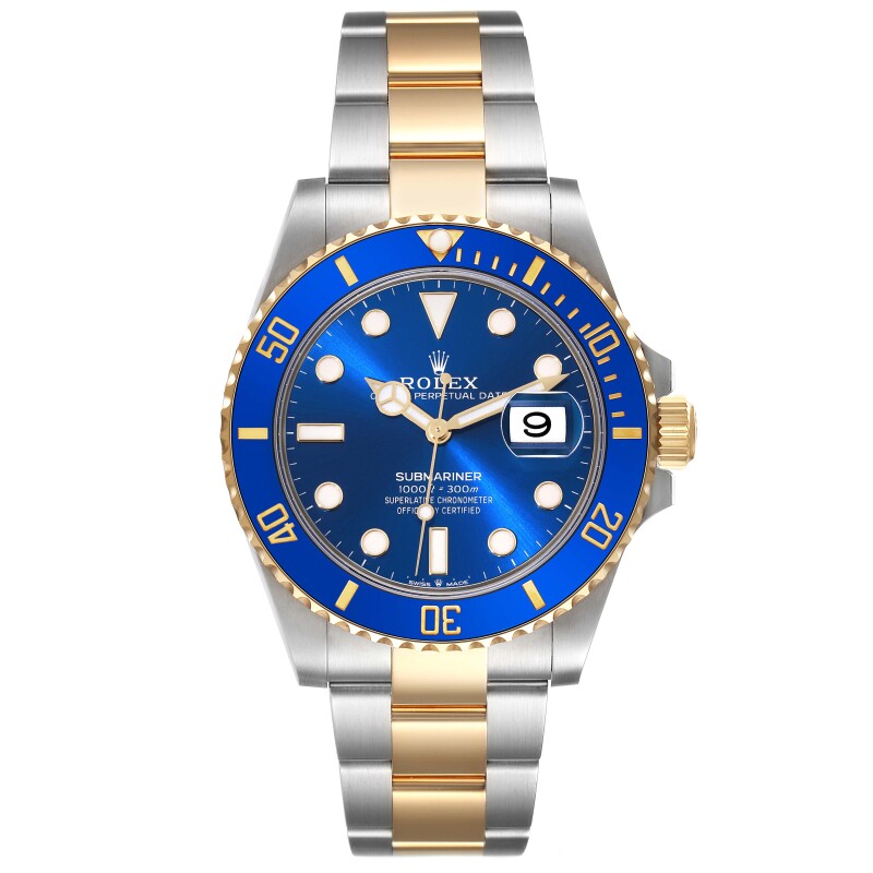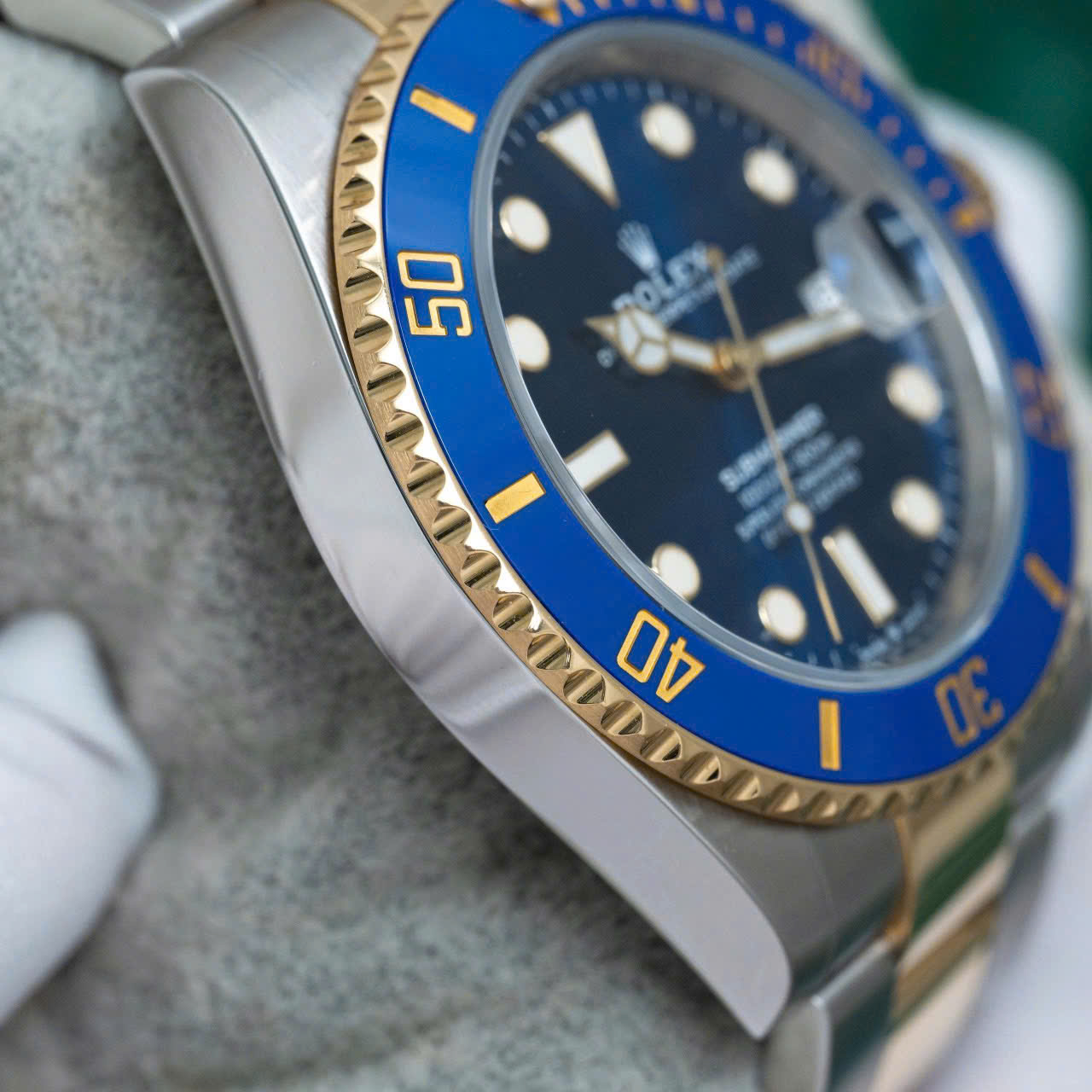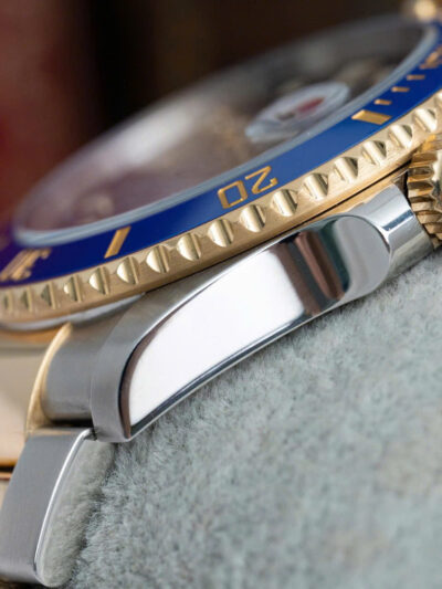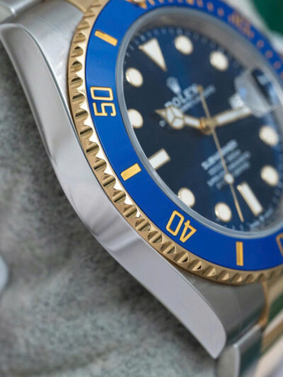 Mặt số màu xanh dương đặc trưng (LB – Lunette Bleue), đi kèm với viền bezel gốm Cerachrom chống trầy màu xanh, tạo nên sự hài hòa và cuốn hút ngay từ cái nhìn đầu tiên. Các cọc số và kim đồng hồ được làm từ vàng, được phủ chất liệu Chromalight phát sáng trong bóng tối, đảm bảo dễ dàng xem giờ trong mọi điều kiện ánh sáng. Thiết kế viền bezel xoay một chiều 60 nấc cũng là đặc trưng của dòng Submariner, giúp người đeo theo dõi thời gian lặn một cách chính xác và an toàn.