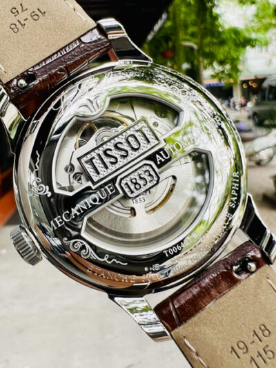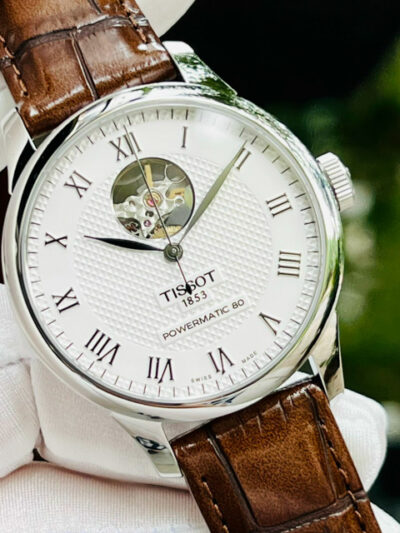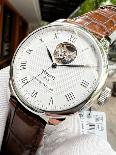 - TISSOT LE LOCLE POWERMATIC 80 T006.407.16.033.01 vẻ đẹp sang trọng, quý phái.Mặt dial trắng hở tim máy góc 12h.Bộ kim thanh mảnh cùng Cọc số La Mã cổ điển, đính nổi trên mặt dail. Dây da mềm mại, lịch sự và sang trọng cho phép chủ nhân tha hồ diện đồ công sở.