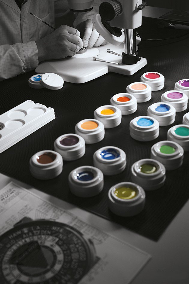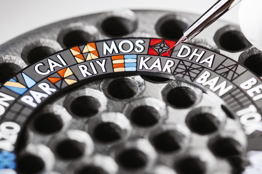 Các nghệ nhân tô màu cho bức tranh thu nhỏ trên các đĩa thành phố của chiếc đồng hồ Louis Vuitton Escale Worldtime