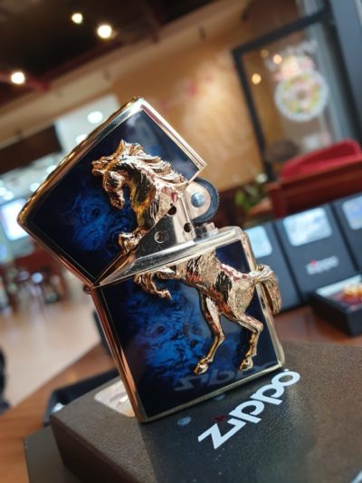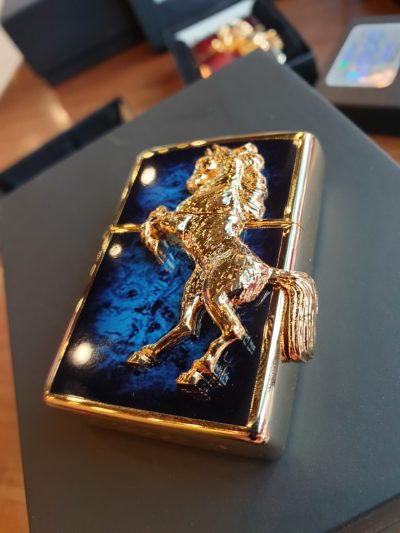 Zippo chính hãng ốp ngựa mạ vàng, tráng men xanh
